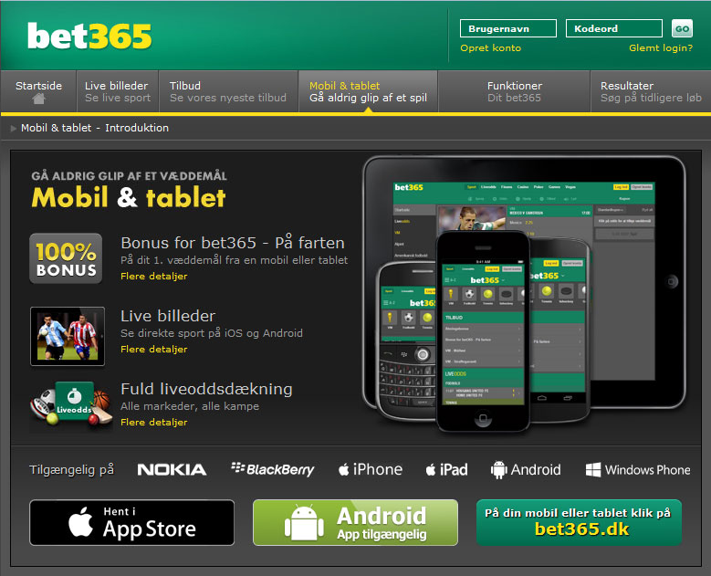 Det er super let at indsætte og udtrække penge fra Bet365s betting app og du kan bruge alle de samme metoder som du finder når du sidder foran din computer. Bet365 har gjort det let for dig at bette mens du er på farten fra din mobil eller tablet.